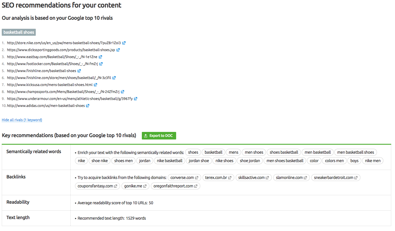 Creating optimized content can be a difficult task to handle but it can be made easier by seeing what your top competition is doing. The Content Template gives you optimized suggestions for your content based on what your top competitors are using.